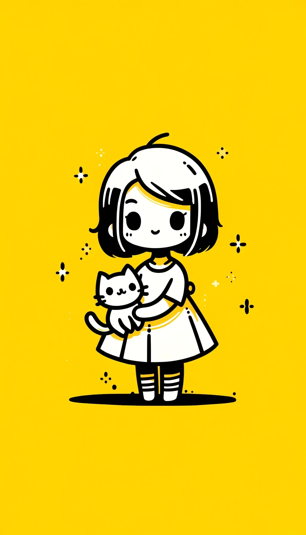 我们输入同一提示词:请帮我画一幅画一个可爱的卡通女孩穿着裙子,抱着一只白色的小猫,全身,黄色背景,Keith Haring 风格的涂鸦,清晰的插图,大胆的线条和纯色,简单的细节,极简主义,黄色背景。