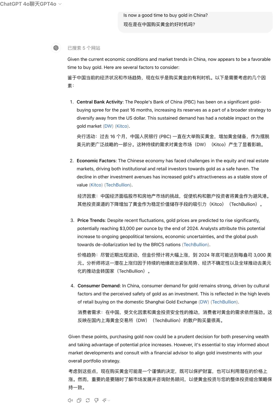 其次,从回答内容上来说,腾讯元宝似乎更胜一筹。GPT-4o 仅仅给出了购买黄金需要考虑的几个因素,而腾讯元宝的答案涵盖黄金价格走势预测、投资风险以及投资策略,而且每条均有引用,这就避免了大模型「满嘴跑火车」的缺点。