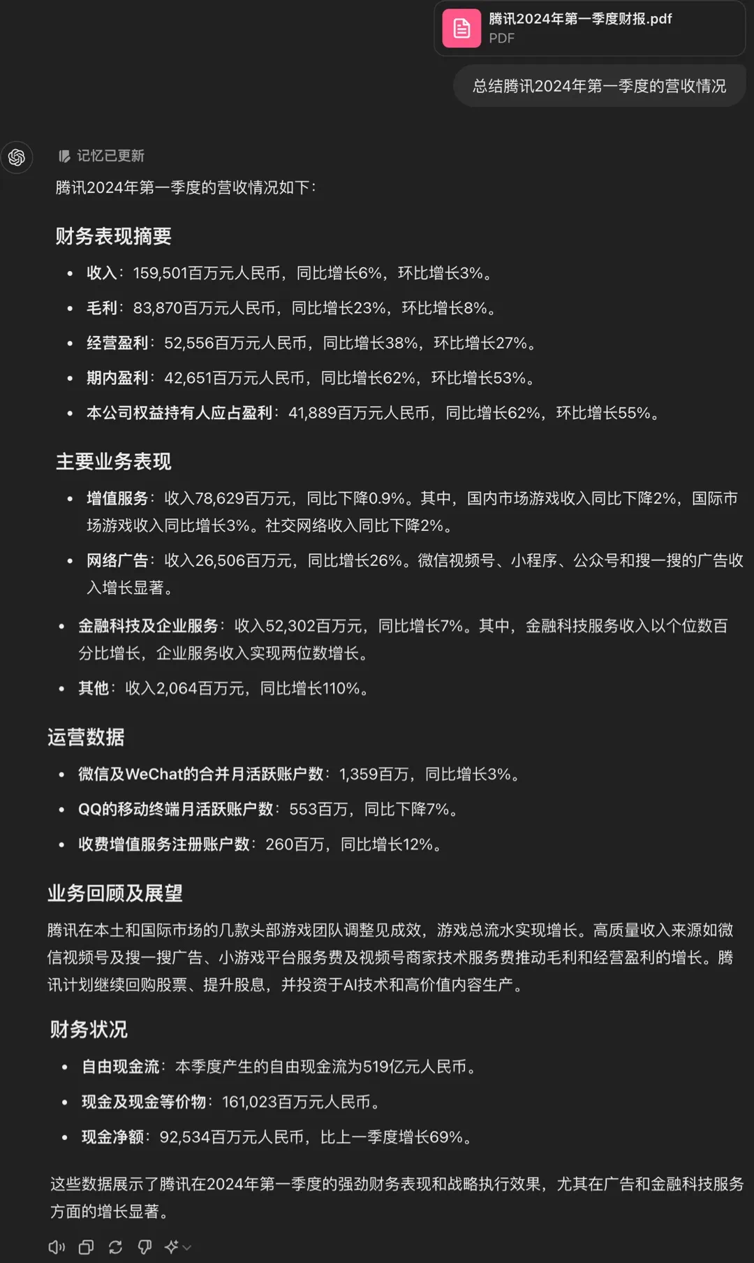我们将这份财报分别上传到腾讯元宝和 GPT-4o,让他们各自分析一下腾讯开年第一季度的营收情况。