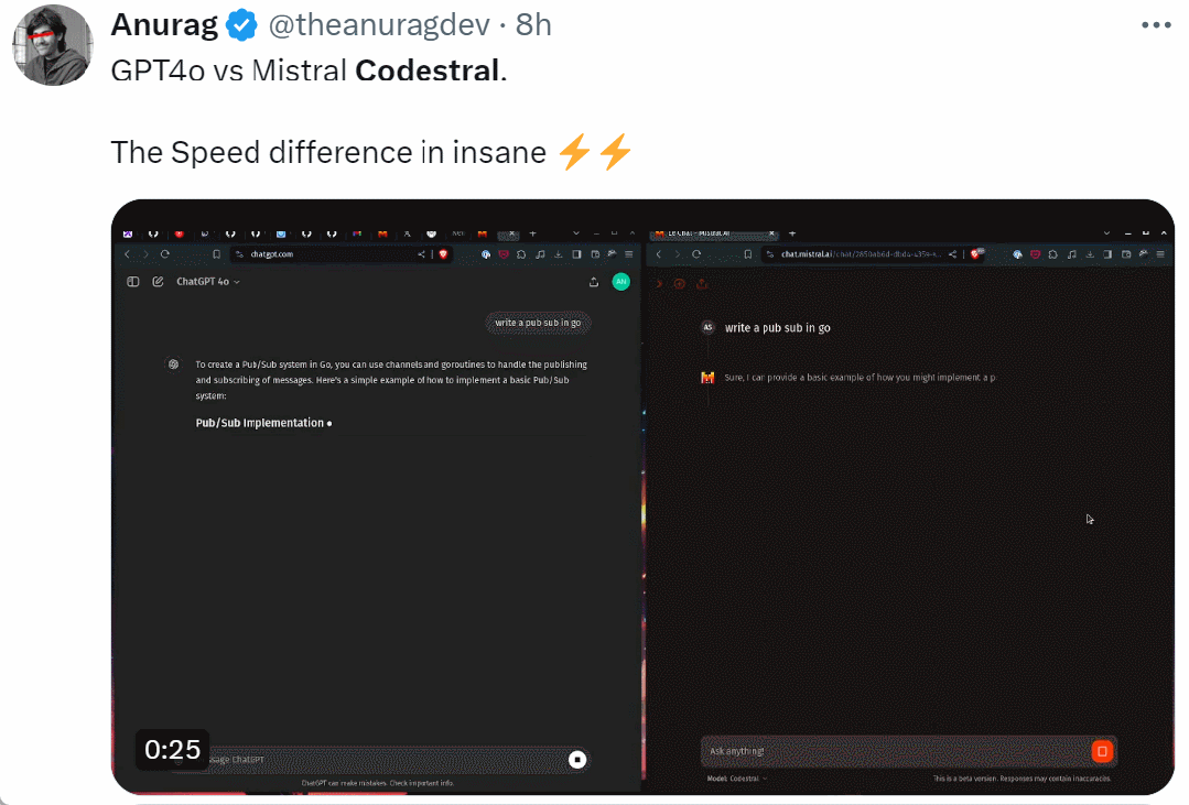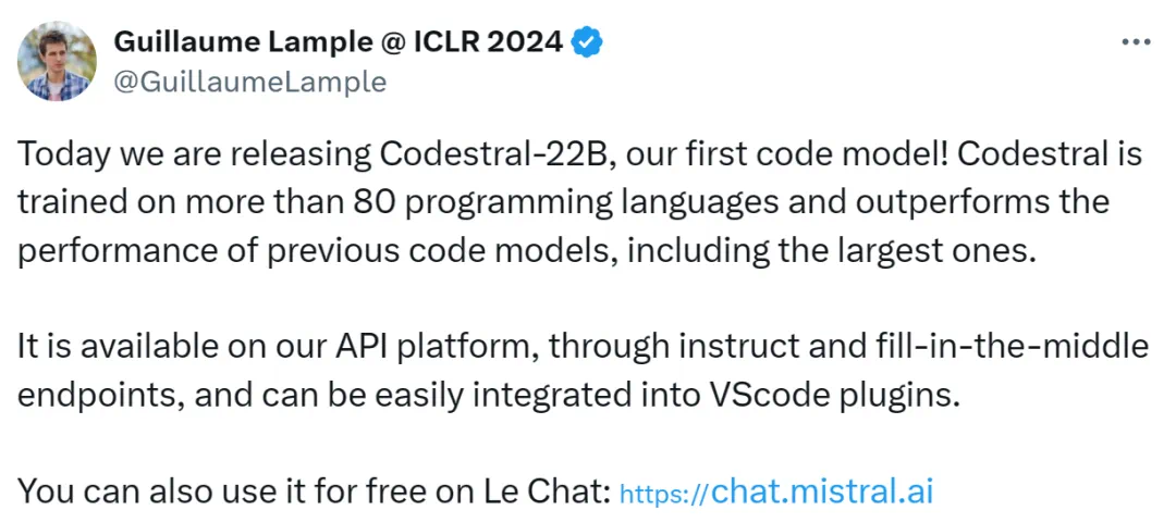 对标 OpenAI 的法国 AI 独角兽 Mistral AI 有了新动作:首个代码大模型 Codestral 诞生了。作为一个专为代码生成任务设计的开放式生成 AI 模型,Codestral 通过共享指令和补全 API 端点帮助开发人员编写并与代码交互。Codestral 精通代码和英语,因而可为软件开发人员设计高级 AI 应用。Codestral 的参数规模为 22B,遵循新的 Mistral AI Non-Production License,可以用于研究和测试目的,但禁止商用。目前,该模型可以在 HuggingFace 上下载。