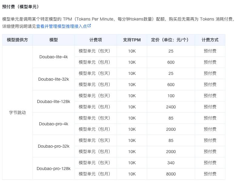 此外,豆包大模型公布了最新的“预付费”模型单元价格。“预付费”是以调用某个特定模型的 TPM 配额,企业购买后无需再为 Tokens 消耗付费,提前为可以预见的流量波动规划好算力 。
