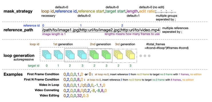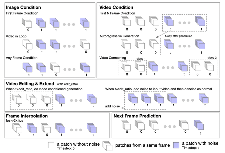 作者团队表示,基于Transformer的特性,可以轻松扩展 DiT 架构以支持图像到图像以及视频到视频的任务。他们提出了一种掩码策略来支持图像和视频的条件化处理。通过设置不同的掩码,可以支持各种生成任务,包括:图生视频,循环视频,视频延展,视频自回归生成,视频衔接,视频编辑,插帧等。