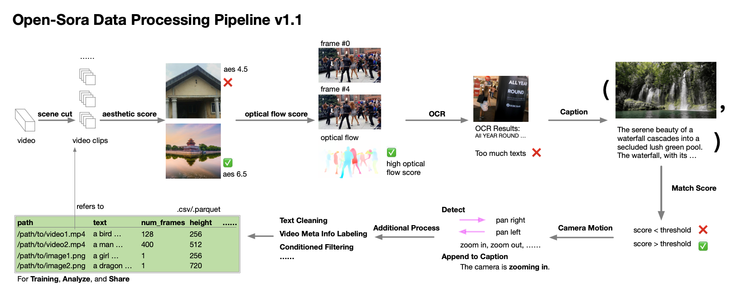作者团队甚至对数据收集与处理环节也提供了详尽的指南。根据作者在技术报告中的阐述,在Open-Sora 1.0的开发过程中,他们意识到数据的数量和质量对于培育一个高效能模型极为关键,因此他们致力于扩充和优化数据集。他们建立了一个自动化的数据处理流程,该流程遵循奇异值分解(SVD)原则,涵盖了场景分割、字幕处理、多样化评分与筛选,以及数据集的管理系统和规范。同样,他们也将数据处理的相关脚本无私地分享至开源社区。对此感兴趣的开发者现在可以利用这些资源,结合技术报告和代码,来高效地处理和优化自己的数据集。
