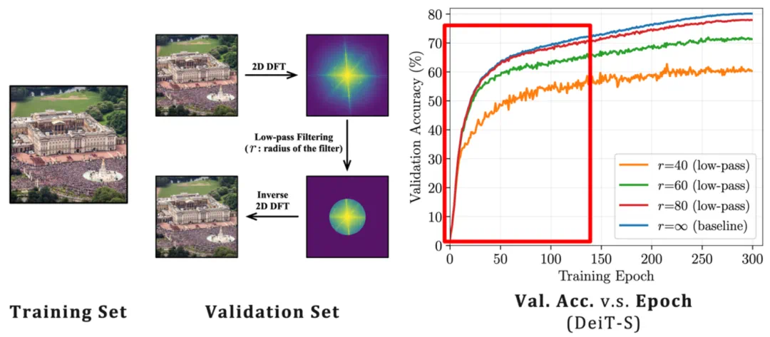 图 6 在相当长的一段早期训练阶段中仅向模型提供低频分量并不会显著影响最终性能