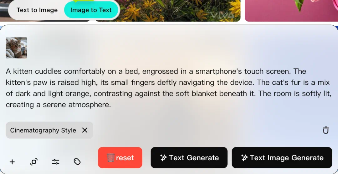 Viva 上线了「Image to Text」功能,只要上传一张图片,就能吐出相应的提示词。