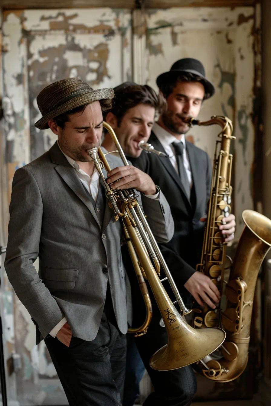 中文提示词 1: 灵魂乐队用铜管乐器演奏,气氛温馨,2:3。