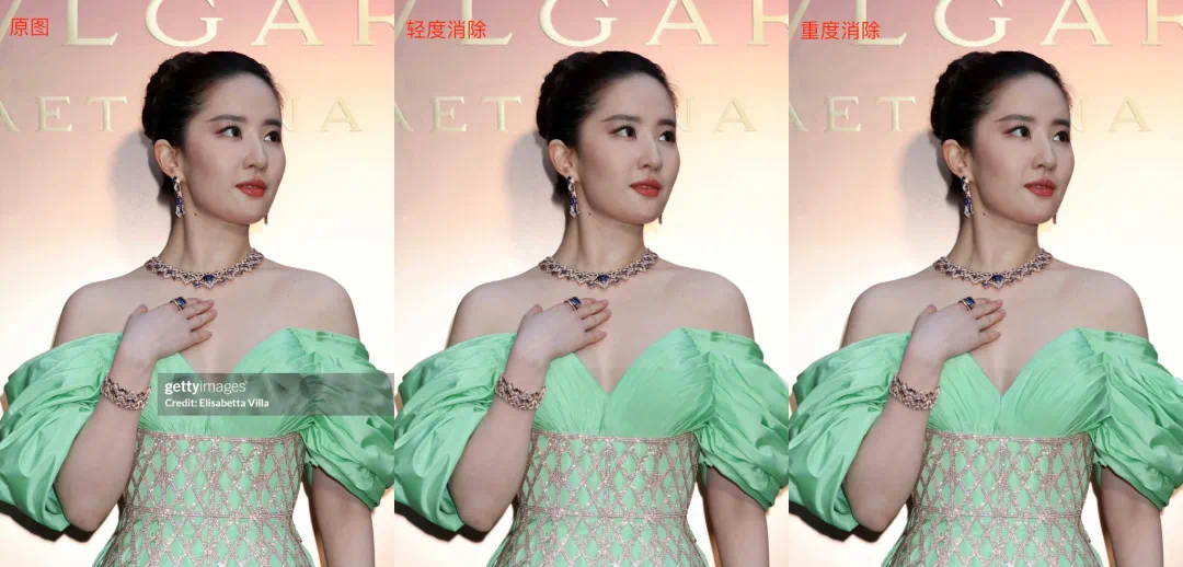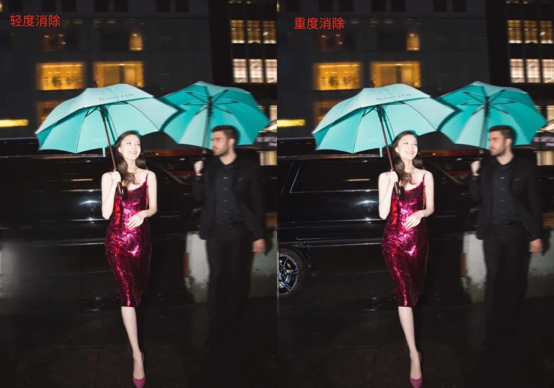 「轻度消除」会有 P 图痕迹,而且画面较为模糊;「重度消除」则效果更佳,Viva 会将消除的背景巧妙地补上。