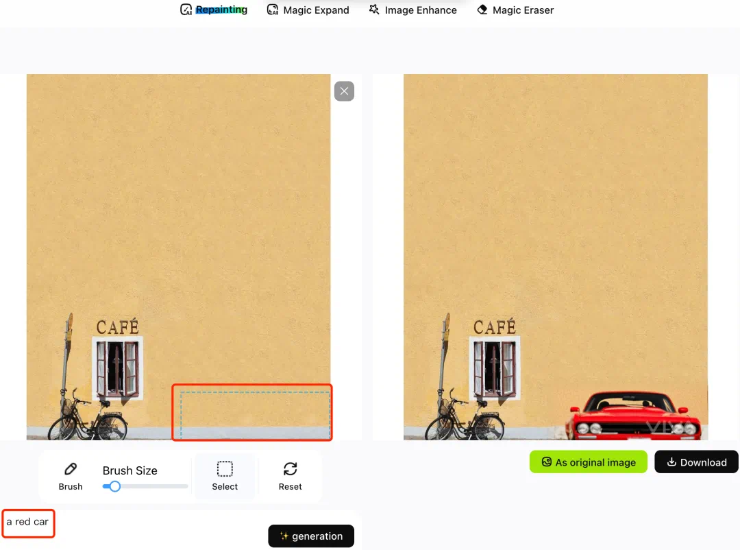 点击「Repainting」,进入操作界面后,我们上传一张图片,只需轻轻涂抹想要修改的区域,然后输入提示词即可。