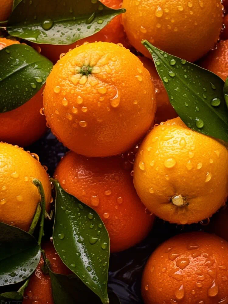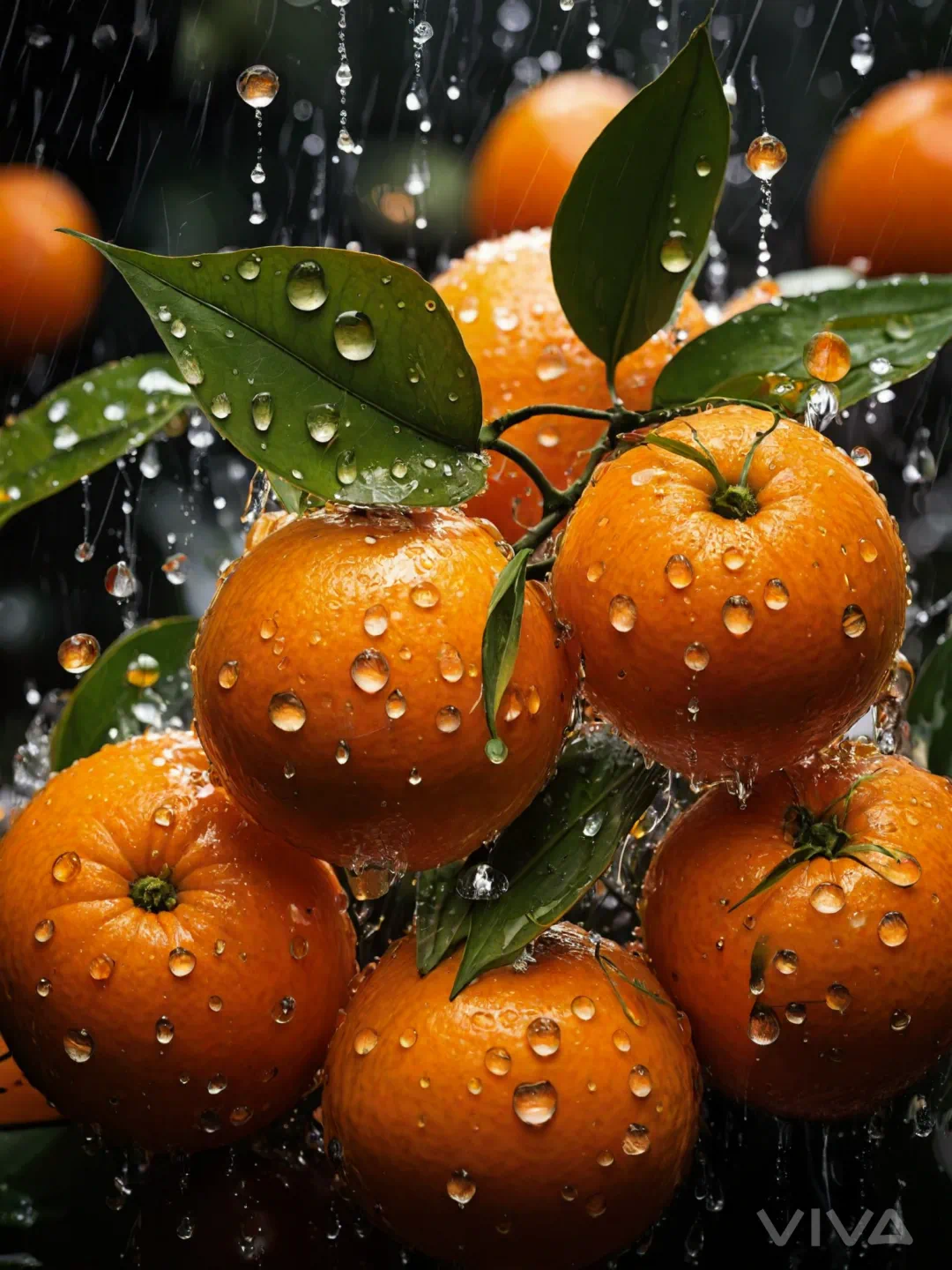 Prompt 3:a photo of a bunch of orange,surrounded by drops of rain water, in the style of orange abundant symbolism, sparklecore, unpolished authenticity, humor meets heart, leaf patterns, folk/naive,3:4