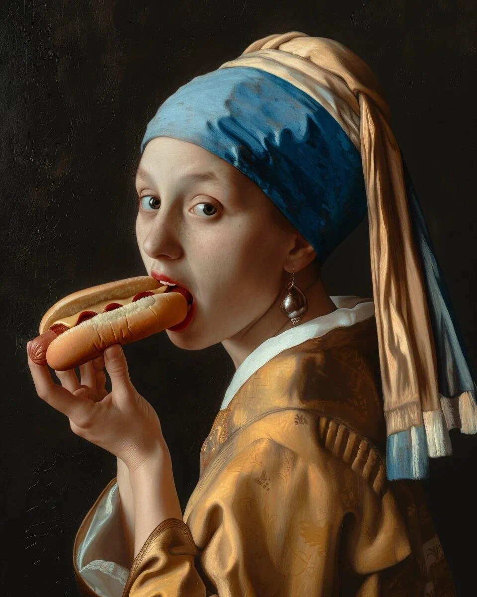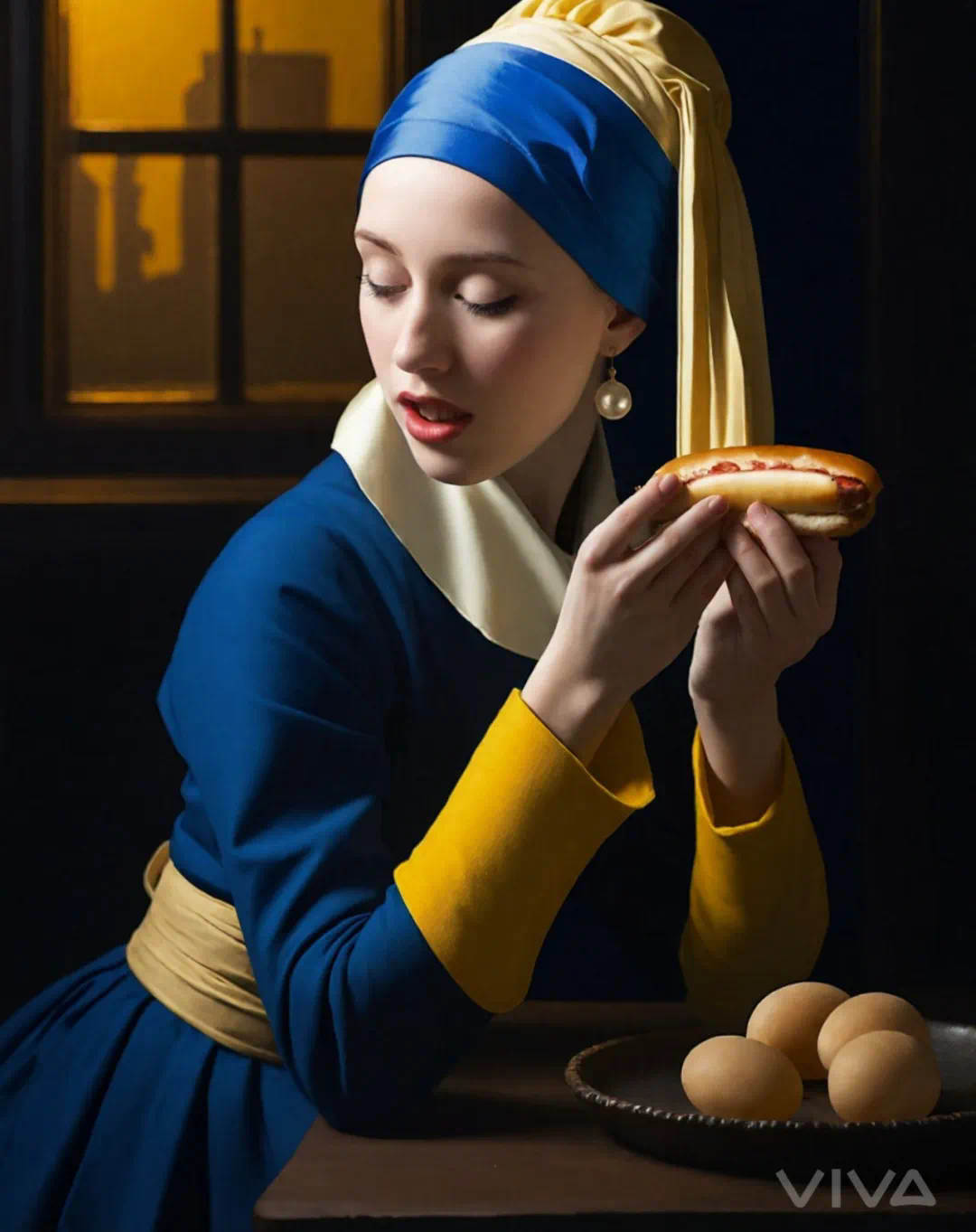 Prompt 4:Recreate the iconic painting’Girl with a Pearl Earring’ by Vermeer (maintaining the same interior background as seen in the original artwork) featuring the subject taking a huge bite out of a hot dog she is holding with both hands