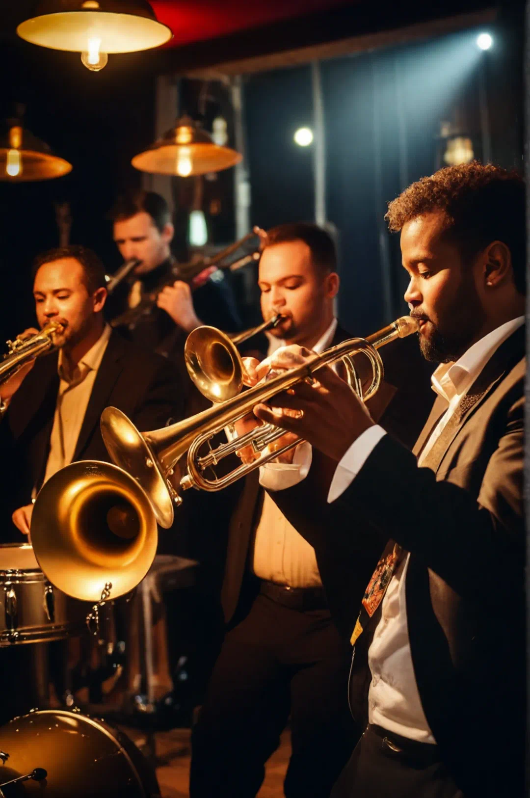Prompt 1:Soul band with brass instruments, warm and intimate atmosphere,2:3。