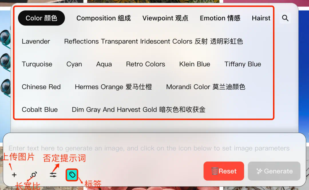Viva 提供颜色、艺术家、风格、发型、环境、照明等 13 种类型标签。
