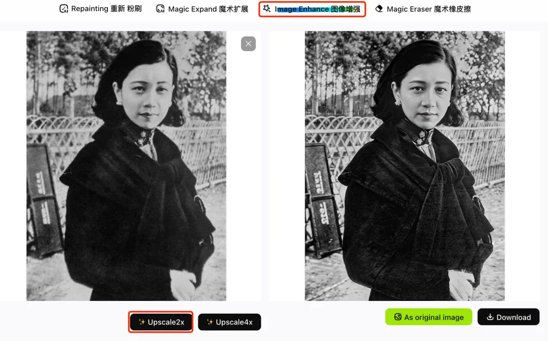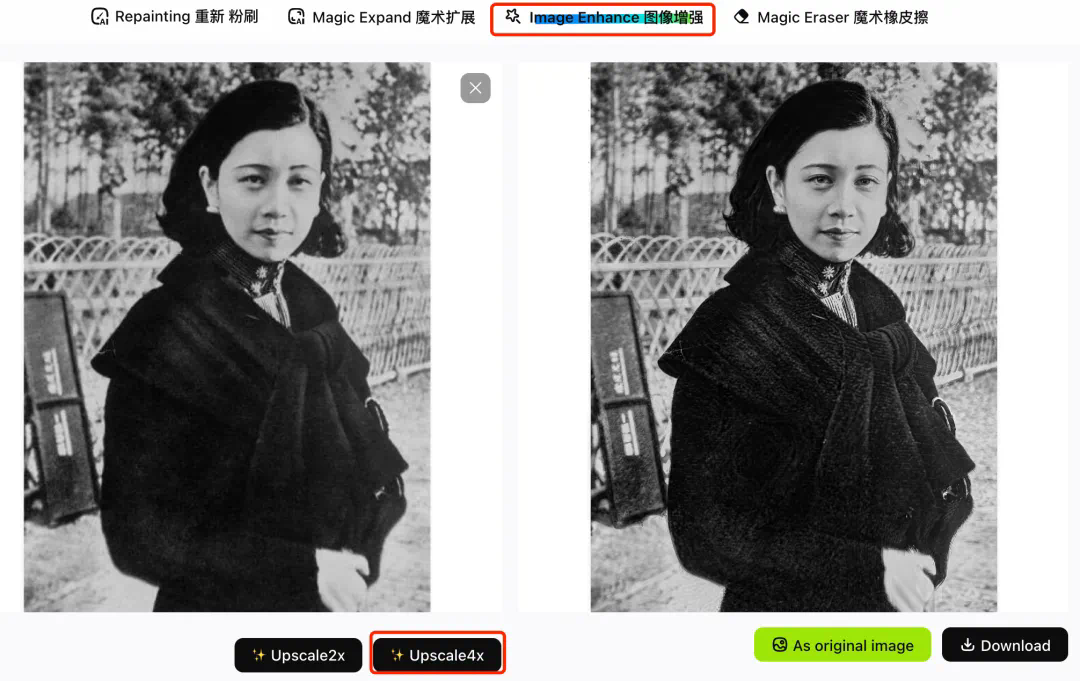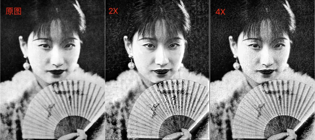 我们上传了一张阮玲玉的旧照,以下是增强 2 倍的效果。