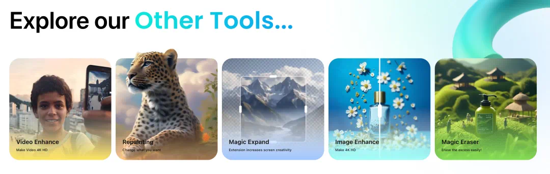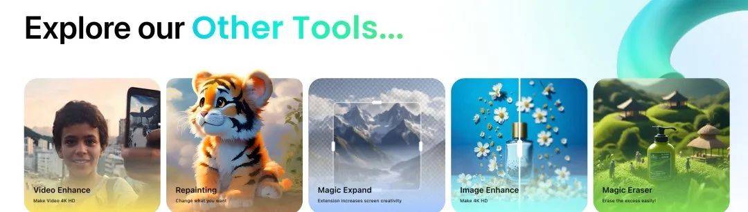 进入 Viva 官网,找到「Explore our Other Tools…」栏目,其下有 AI 修图、AI 扩图、AI 画质增强和 AI 消除等一系列功能。