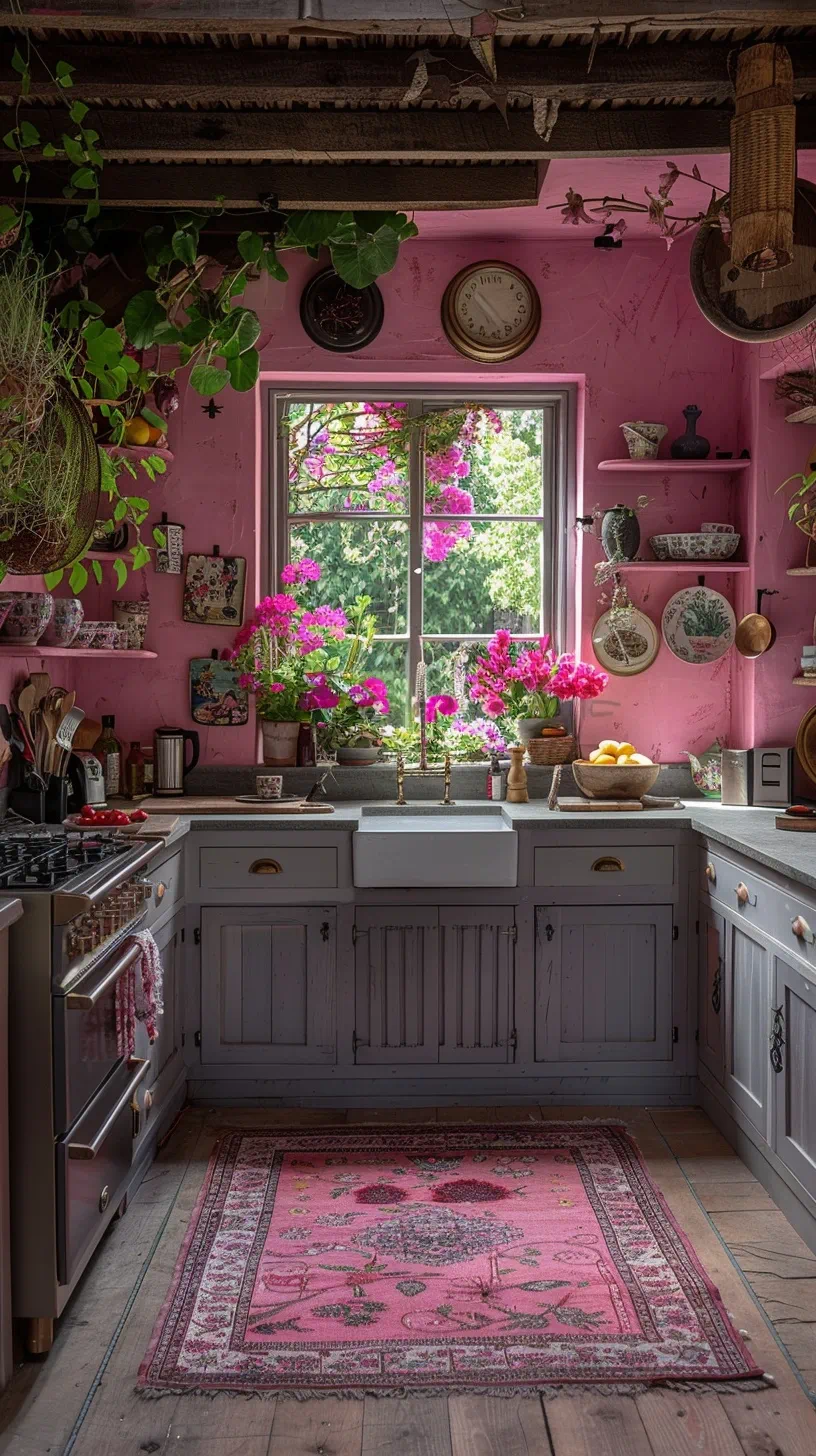 中文提示词 2: 完美风格的露天彩绘,英式小屋,户外粉红色,乡村风格厨房,带有质朴的元素,房屋和花园,杂志拍摄,9:16。