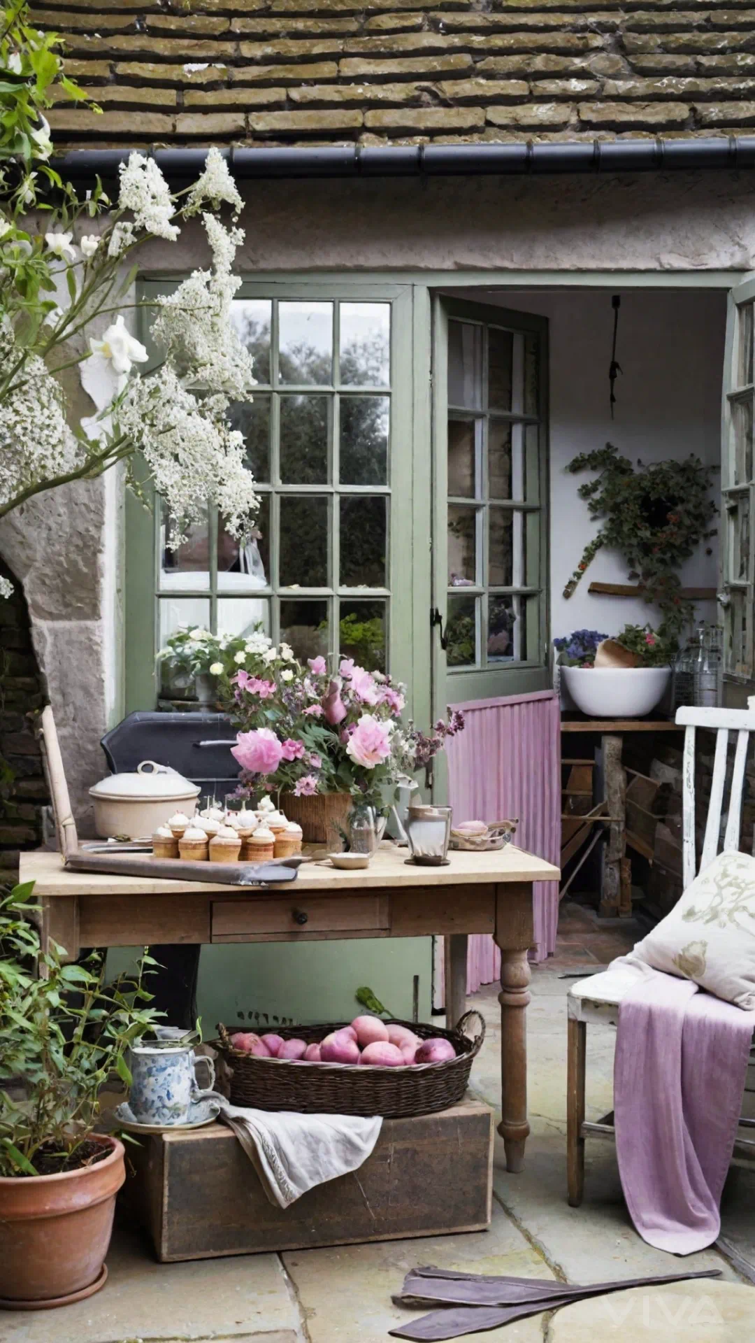 Prompt 2:perfectly styled alfresco painted English cottage outdoor pink country style kitchen with rustic elements. House and garden magazine photoshoot,9:16.