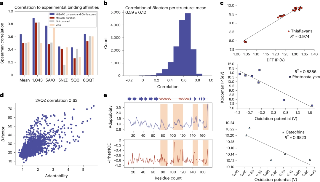 该团队还提供了各种预处理脚本来过滤和可视化数据集。而且,提供了示例 AI 基线模型,用于计算量子化学性质(化学硬度和电子亲和力)、结合亲和力计算以及预测蛋白质灵活性或诱导拟合特征,从而使数据可以被简化采用。并且,QM、MD 和 AI 模型在实验数据上得到了广泛的验证。