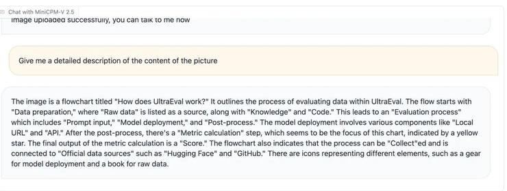 MiniCPM-Llama3-V 2.5 不仅能够轻松看懂流程图中不同模块的文字、箭头之间的空间位置和复杂逻辑关系 ,还能给出清晰易懂的解释说明: