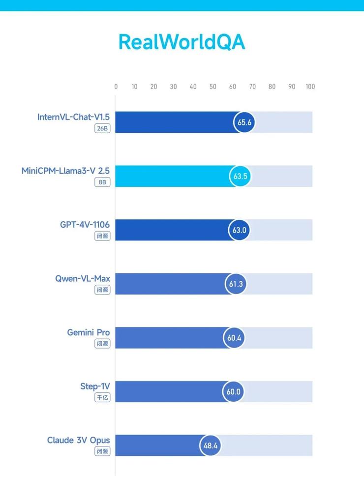 空间理解能力上,在专注于评估多模态模型基本现实世界空间理解能力的 RealWorldQA 榜单上,MiniCPM-Llama3-V 2.5 再次超越 GPT-4V 和 Gemini Pro: