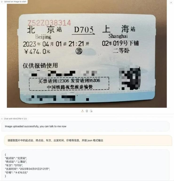 输入一张手机拍摄的火车票,MiniCPM-Llama3-V 2.5 能准确提取信息,给出无误的「json」格式输出: