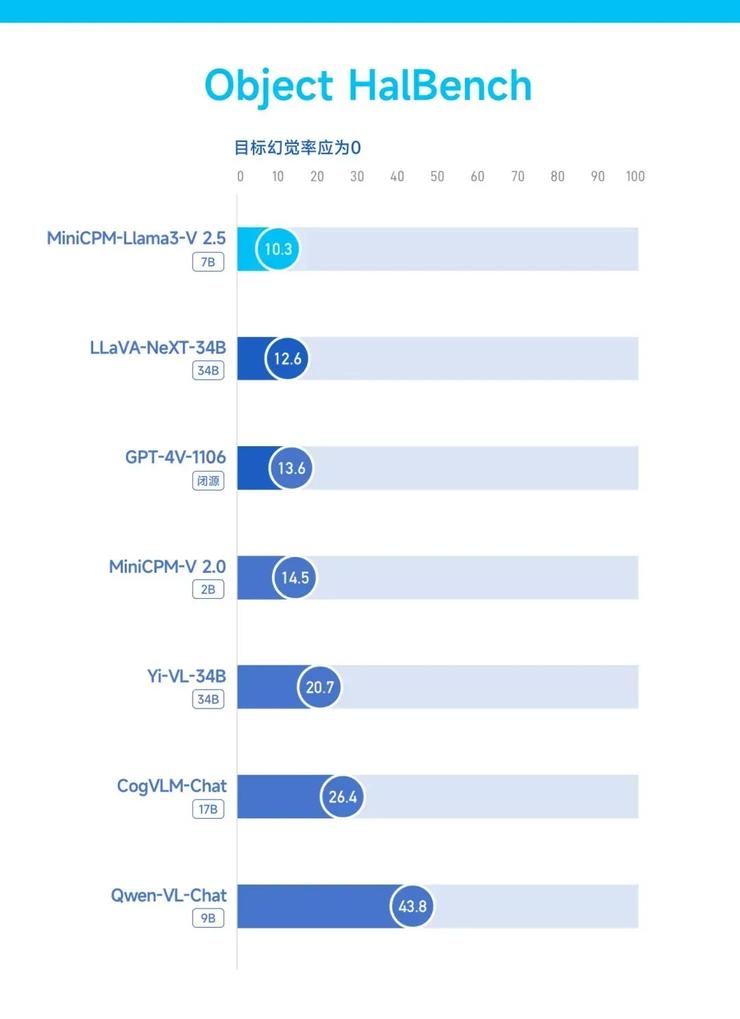 幻觉能力上,MiniCPM-Llama3-V 2.5 在Object HalBench 榜单上超越了 GPT-4V 等众多模型(注:目标幻觉率应为0):