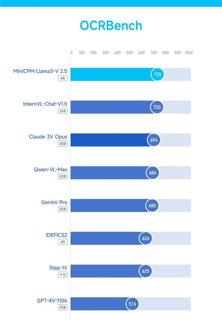 OCR 识别中,在 OCR 综合能⼒权威榜单 OCRBench 上,面壁「多模态小钢炮」超越了Claude 3V Opus、GeminiPro 等标杆模型,也超过了原先排名第一的上海人工智能实验室 InternVL-Chat-V1.5、最新霸榜第一!