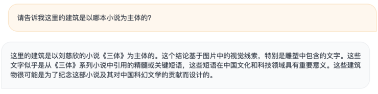 面壁智能 MiniCPM-Llama3-V 2.5 很快就能推理出这些建筑是为了纪念《三体》及其对中国科幻文学的贡献而设计: