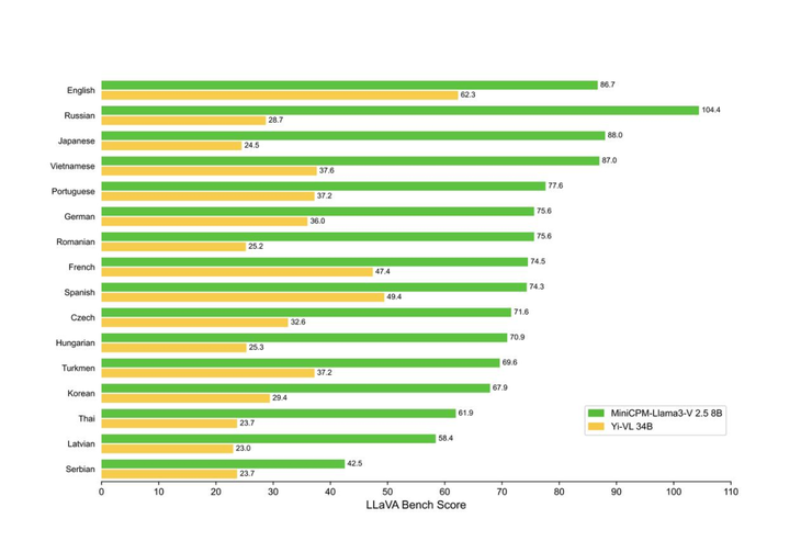 在对话中,MiniCPM-Llama3-V2.5 表现出了良好的多语言多模态对话性能。与目前国内较为领先的零一万物多模态模型 Yi-VL 34B 为参照,多语言版本 LLaVABench 评测结果显示,MiniCPM-Llama3-V2.5 对话能力更胜一筹: