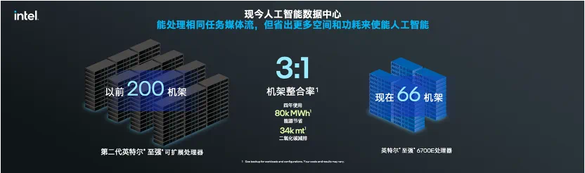 英特尔® 至强® 6 能效核处理器具备高密度内核,极大提升了机架密度 —— 可将 200 个基于第二代英特尔® 至强® 处理器的系统机架替换为仅 66 个,这意味着在更小的空间和更低的功耗条件下,能够处理相同的工作负载。