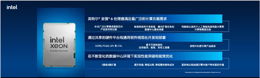 拥抱数据中心云化以及 AI 应用的新机遇,为高质量发展提供高效、绿色低碳的算力底座是计算基础设施迈向智能新时代的重要方向。英特尔® 至强® 6 能效核处理器以创新架构,通过提升数据中心的性能和能效并降低成本,助其应对不断变化的商业环境,为用户打造更丰富、更优质的服务。针对 AI 工作负载的高算力需求,英特尔计划在今年推出更高性能的性能核(P-core)版本。借助英特尔® 至强® 6 处理器的 E-core 和 P-core 的兼容性,单一平台便能满足出色的 AI 性能、高能效和云端的可扩展性,帮助数据中心高效满足不断增长的多元化需求。