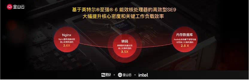 金山云发布第九代云服务器高效型 SE9,携手英特尔引领云计算能效新纪元,面向计算、网络和存储方面进行了深度优化,首次支持单实例高达 256 核 vCPU,实现核心密度翻倍。相比线上主售机型,整机整数计算性能提升达 3 倍2 ,同规格套餐性价比提升超过 60%3 ,而 Nginx 和转码整机性能以及在 Redis 业务场景下的读写性能,分别实现了最高达 2.6 倍4 、3.55 倍 和 2.8 倍6 的提升。