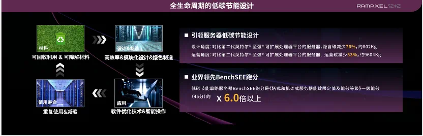 记忆科技推出低碳节能服务器,采用模块化设计,实现了全生命周期的低碳节能设计。与第二代至强平台相比,隐含碳减少 76%11 ,运营碳减少 53%12 。其 BenchSEE 跑分高于《塔式和机架式服务器能效限定值及能效等级》一级能效(45 分)的 6 倍以上13。
