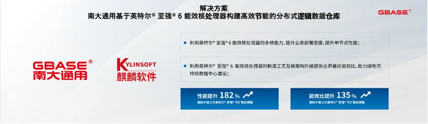 南大通用构建的高效节能分布式逻辑数据仓库,充分利用英特尔® 至强® 6 能效核处理器的多核能力,提升业务部署密度和单节点性能,使 Gbase 8a MPP 性能提升 182%9 、能效比提升 135%10 ,助力绿色可持续数据中心建设。
