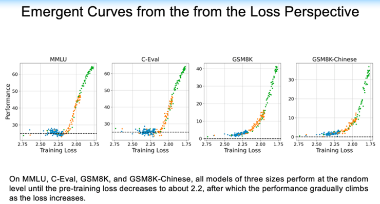 将训练损失标为 X 轴、模型性能标为 Y 轴后,研究人员发现,如果训练损失达到了2.2的阈值,模型性能就会攀升。由此可见,模型的“涌现能力”除了与模型大小、训练数据量紧密关联,也可能源自于训练损失。