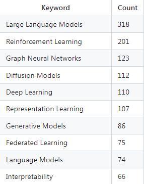 根据 ICLR 公布的接收论文数据,被提及次数最多的前十个关键词分别是:大语言模型(LLM)、强化学习、图神经网络、扩散模型、深度学习、表征学习、生成模型、联邦学习、语言模型与可解释性。