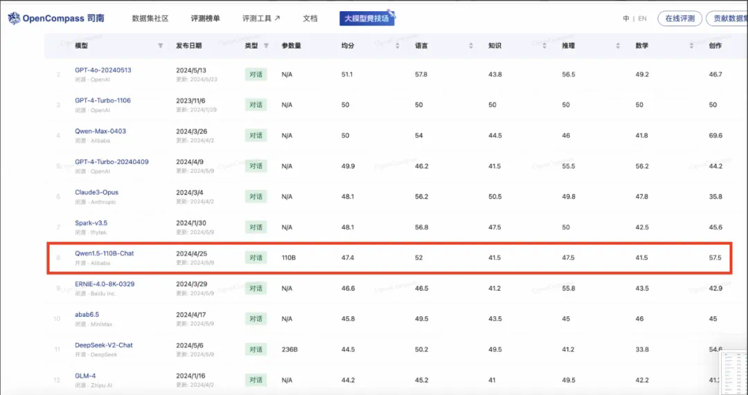 OpenCompass 大模型测评榜单上,此前开源的 Qwen1.5-110B 已领先于文心 4.0 等一众国内闭源模型。