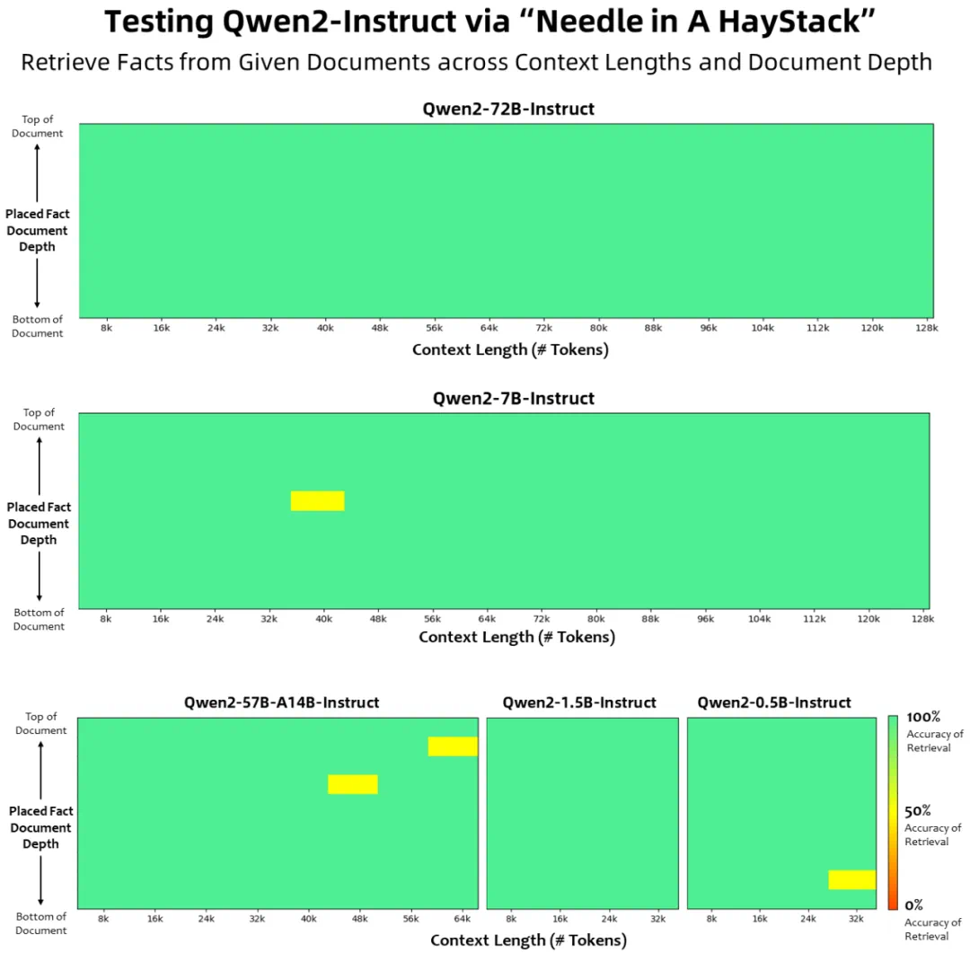 此外,Qwen2 系列中的其他模型的表现也十分突出:Qwen2-7B-Instruct 几乎完美地处理长达 128k 的上下文;Qwen2-57B-A14B-Instruct 则能处理 64k 的上下文长度;而该系列中的两个较小模型则支持 32k 的上下文长度。