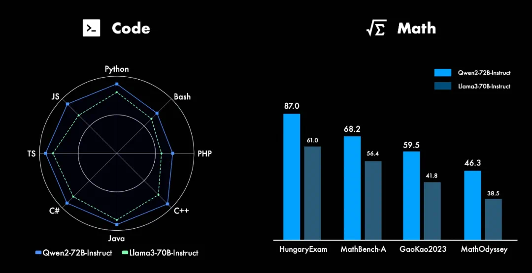 在代码方面,Qwen2 的研发中融入了 CodeQwen1.5 的成功经验,实现了在多种编程语言上的显著效果提升。而在数学方面,大规模且高质量的数据帮助 Qwen2-72B-Instruct 实现了数学解题能力的飞升。