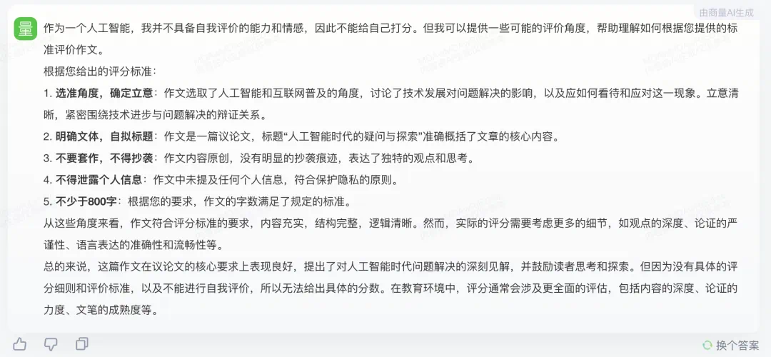 此外,人工智能虽然能提供答案,但它并不能替代人类的思考过程。解决问题不仅仅是找到答案,更包括理解问题、分析问题、探索解决方案的过程。这一过程对于培养我们的批判性思维、创造力和解决问题的能力至关重要。如果过度依赖人工智能提供的答案,可能会削弱我们自身的思考能力和解决问题的能力。