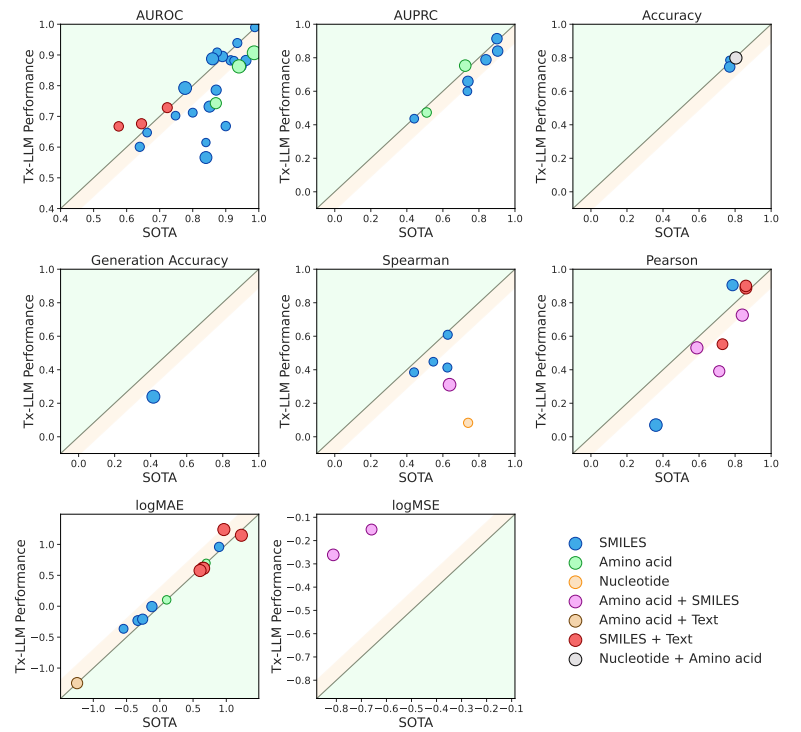 仅使用一组权重,Tx-LLM 可同时处理与自由文本交织的各种化学或生物实体(小分子、蛋白质、核酸、细胞系、疾病)信息,使其能够预测广泛的相关属性。在 66 个任务中的 43 个任务上实现了与最先进 (SOTA) 技术相媲美的性能,并在 22 个任务中超越了 SOTA。