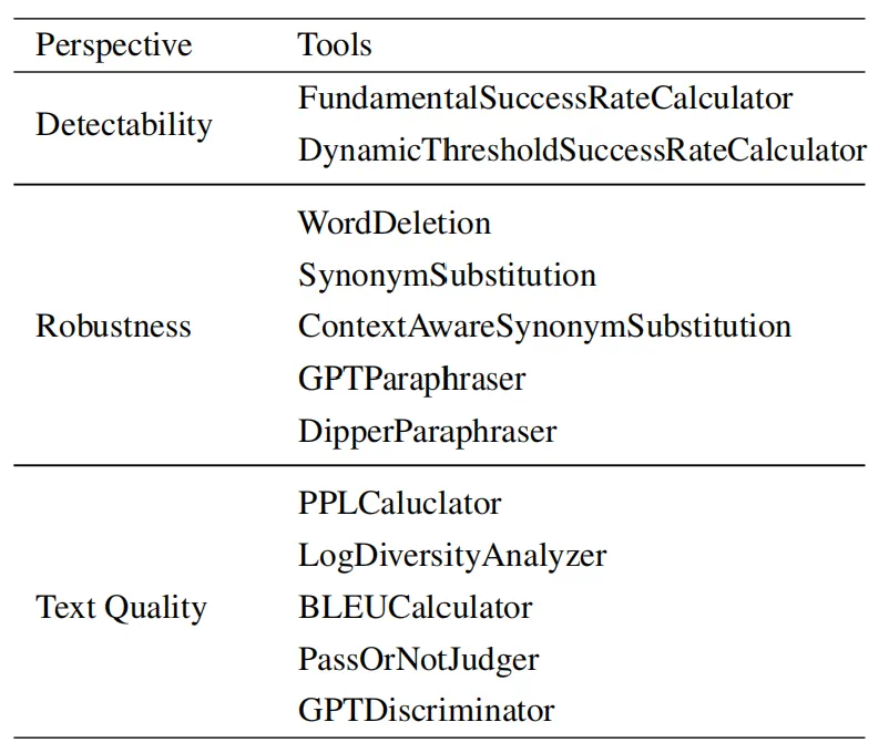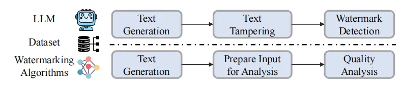 评估⻆度和指标多样(包含可检测性、鲁棒性、对⽂本质量的影响等),且⼀次评估涉及多步骤,全⾯快速评估算法性能极具挑战。