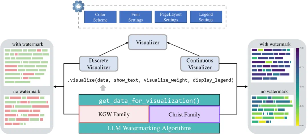 定制化的⼤模型⽔印算法机制可视化解决⽅案:使⽤⼾能够在各种配置下可视化不同⼤模型⽔印算法的内部机制。