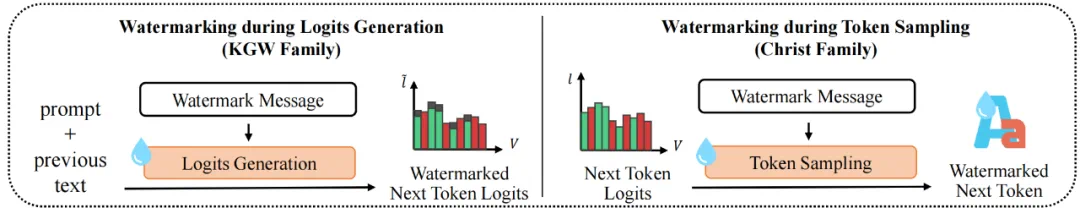 ⽬前主流的⼤模型⽔印算法是在⼤模型推理阶段植⼊⽔印,这类⽅法主要分为两⼤算法家族: