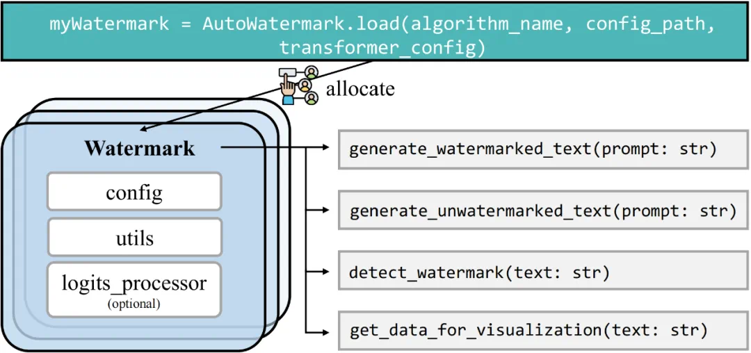 各类⼤模型⽔印算法不断涌现。然⽽它们的实现⼤都基于作者⾃⾝的需求,缺乏统⼀的类和调⽤接⼝设计,使得研究⼈员和⼤众需要投⼊⼤量精⼒去使⽤和复现这些算法。