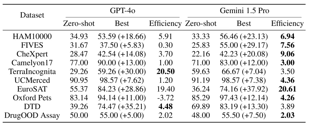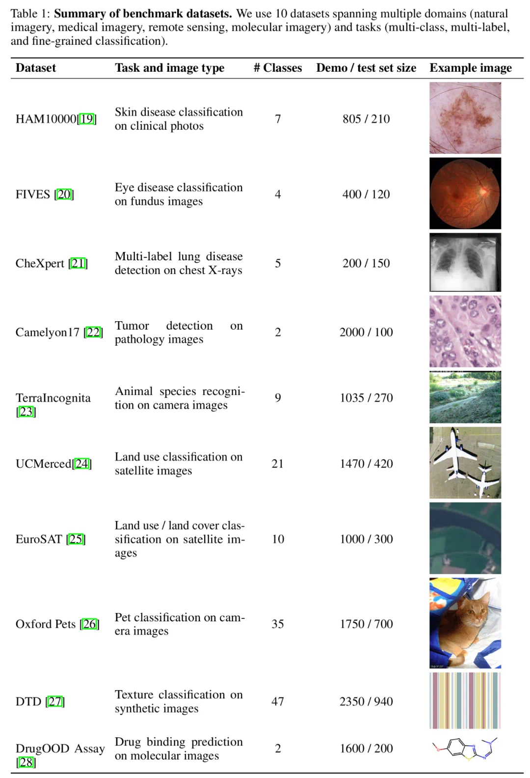 数据集方面,研究团队在 10 个跨越不同领域(包括自然影像、医学影像、遥感影像和分子影像等)和任务(包括多分类、多标签分类和细粒度分类)的数据集上进行了广泛的实验。