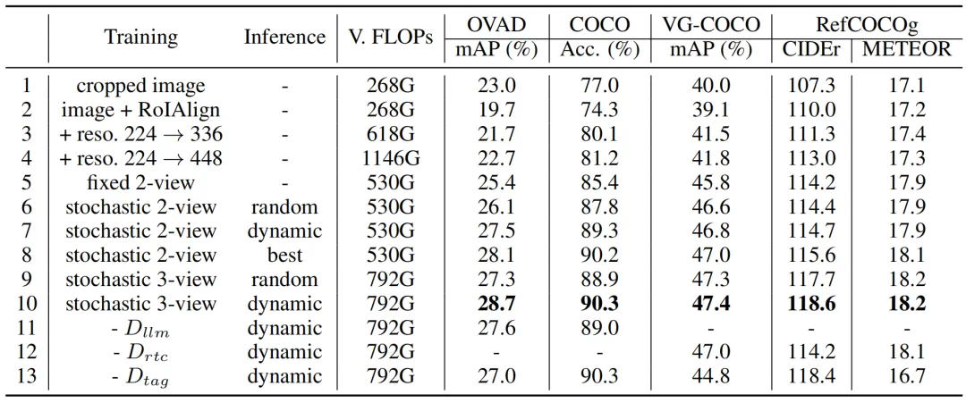 ),属性检测(Attribute detection)获得了更好的结果。这可以解释为这种任务通常需要详细的区域信息。而对于区域级字幕(Region-level captioning)和密集字幕生成(Dense captioning)任务,需要上下文丰富的视图(