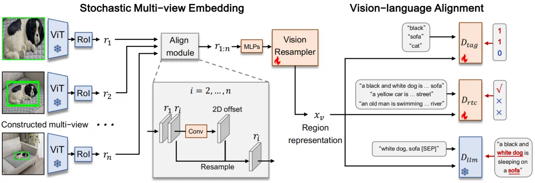 的空间特征然后根据二维偏移重新采样。最后,对齐后的区域嵌入沿通道维度连接并通过 linear 层进行融合。输出进一步通过视觉重采样模块,即 Q-former,进行压缩,从而提取原始图像 x 的参考区域