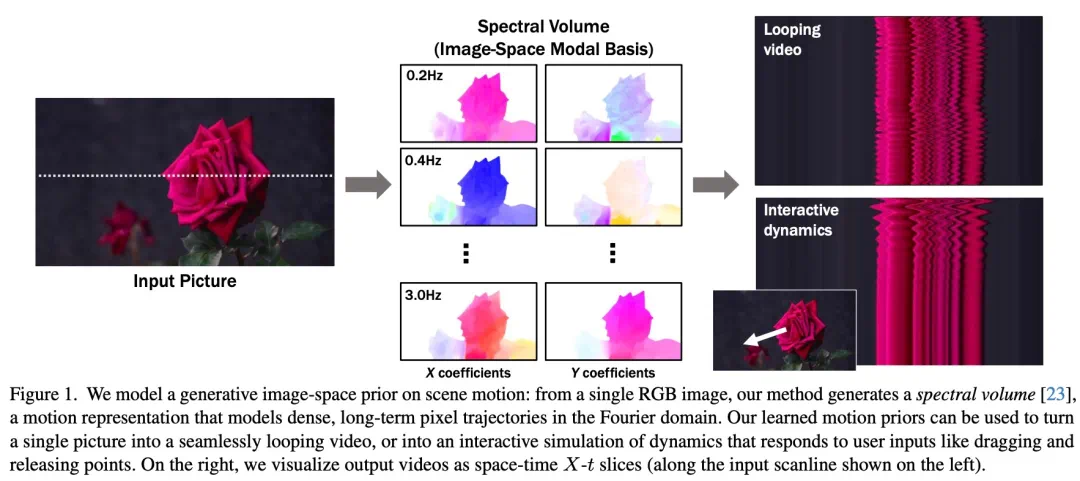 与基于图像的渲染模块一起,预测的运动表征可用于许多下游应用,例如将静止图像变成无缝循环视频,或者允许用户与真实图像中的对象进行交互,产生逼真的模拟动态。