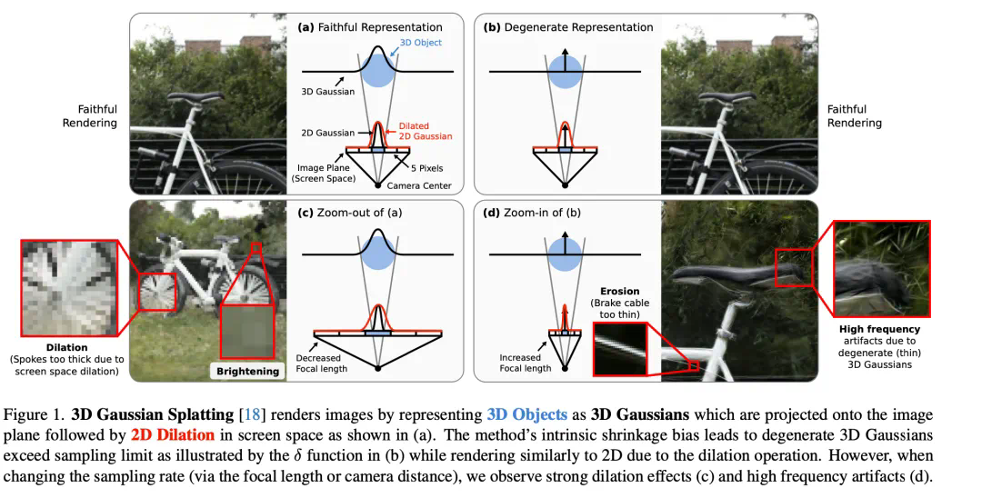 3D 高斯泼溅通过将 3D 对象表示为被投影到图像平面上的 3D 高斯函数,随后在屏幕空间中进行 2D 膨胀处理,如图 (a) 所示。该方法的内在收缩偏差导致退化的 3D 高斯函数超出采样限制,如图 (b) 中的 δ 函数所示,而由于膨胀操作,其渲染效果类似于 2D。然而,当改变采样率(通过焦距或相机距离)时,会观察到强烈的膨胀效应(c)和高频伪影(d)。
