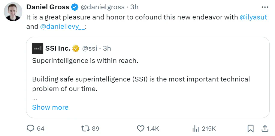 Daniel Gross表示自己很高兴和荣幸与Ilya和Daniel Levy开启这一新事业。